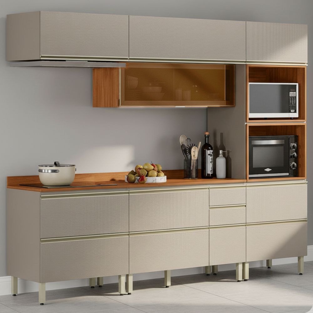 A Cozinha Modulada DP2706 foi projetada para quem busca eficiência, design moderno e funcionalidade na cozinha. O conjunto é composto por 5 peças, produzidas 100% em MDF (20/15 mm) com acabamento em pintura UV. Possui portas com dobradiças metálicas de 35 mm (sendo 6 basculantes com pistão a gás e 1 delas contém vidro Reflecta 3mm), gavetas laterais (uma com divisor de talheres) e gavetão inferior, todas equipadas com corrediças telescópicas. Conta ainda com pés com regulagem de altura, puxadores em alumínio, nicho decorativo funcional, tampo em MDF 20mm e espaços ideais para micro-ondas e forno (de até A.45,4cm x L.64cm x P.51,5cm). NÃO ACOMPANHA COOKTOP/ NÃO ACOMPANHA RECORTE NO TAMPO PARA ENCAIXE. Este produto será entregue em 08 volumes.