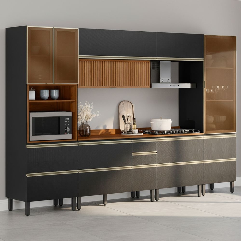 Cozinha Modulada 6 Pecas 330 cm Ripado DP3302 Nogueira Carbono Prime Demartez