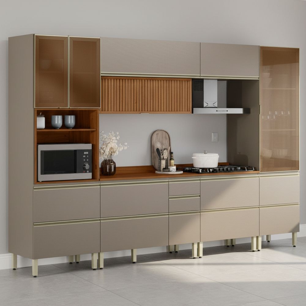 A Cozinha Modulada DP3302 reúne eficiência, durabilidade e excelente aproveitamento do espaço. Composta por 6 peças, produzidas 100% em MDF (20/15 mm) com acabamento em pintura UV. Possui 6 portas basculantes com pistão a gás (sendo 1 com detalhe ripado baixo relevo) e 3 portas de bater em vidro Reflecta 3 mm, gavetas laterais (uma com divisor de talheres) e gavetões inferiores, equipadas com corrediças telescópicas. Conta ainda com pés com regulagem de altura, puxadores em alumínio, nicho decorativo funcional, tampo em MDF 20mm e espaço para micro-ondas ou forno (até A.45,4 cm x L.67 cm x P.51,5 cm). NÃO ACOMPANHA COOKTOP/ NÃO ACOMPANHA RECORTE NO TAMPO PARA ENCAIXE. Este produto será entregue em 12 volumes.