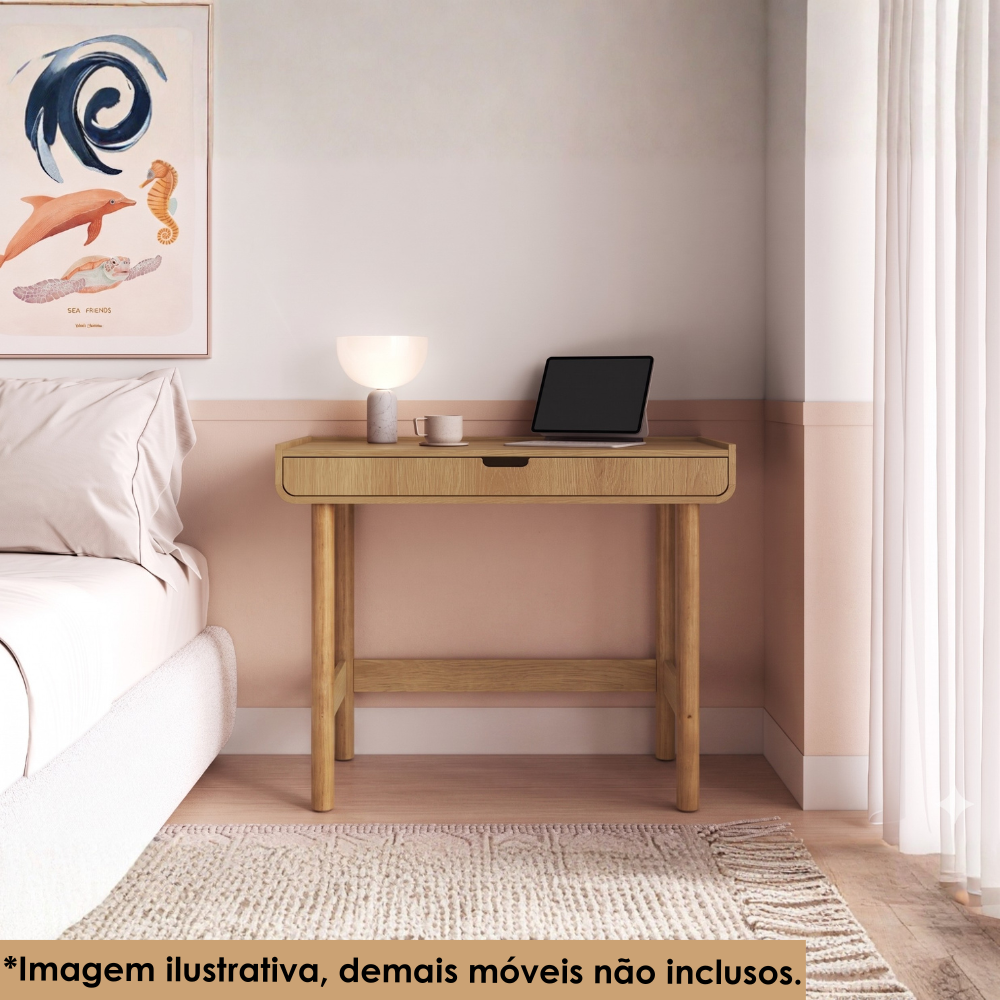 Escrivaninha Aura, design orgânico e escandinavo aliado com funcionalidade para momentos de estudo e trabalho. Estrutura em MDP de 15 mm (fundo em 3 mm) com acabamento BP. Composta por gaveta central equipada por corrediça telescópica e puxador usinado com recorte cava, tampo em formato de bandeja integrada e cantos inferiores arredondados. Seus pés em madeira maciça (50 mm) com reforço de travessas em MDP, que garante mais segurança e estabilidade. COMPUTADOR E DEMAIS DECORAÇÕES NÃO INCLUSOS. Produto será entregue em 1 volume.