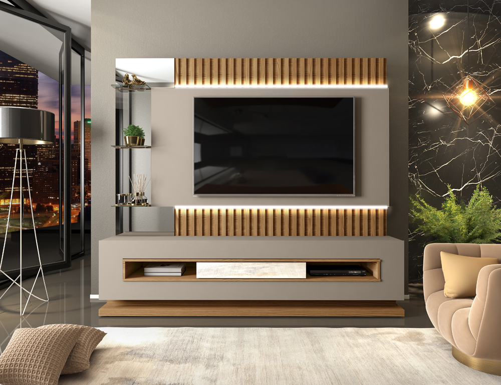 Estante Home Lumus, é ideal para você que procura elegância e modernidade para sua sala de estar. Estrutura 100% em MDF, que proporciona melhor acabamento nas bordas e superfícies, madeira proveniente de reflorestamento, contando com pintura em acabamento UV. Composto por 01 gaveta externa com corrediça telescópica contendo frente com aplicação de espelho, 01 porta central basculante com pistão à gás e detalhes em usinagem, prateleiras em vidro incolor de 5mm, torre de espelhos, nichos para aparelhos eletrônicos, iluminação em fita de LED, furação para passagem de cabos, e 08 pés em PVC cromados de 39mm. É ideal para TVs de até 60 polegadas. Seus momentos de lazer na frente da TV, serão ainda mais prazerosos com este lindo produto. Este móvel chegará em sua casa separado em 04 volumes.