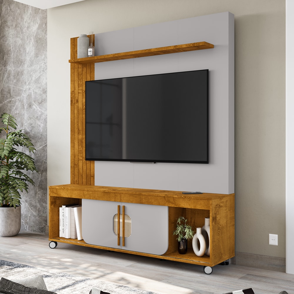 Estante Home Maragogi, design que destaca o ambiente com leveza e funcionalidade. Estrutura em MDP (15/25mm) com acabamento em pintura UV texturizada. Composto por portas de correr com sistema de abertura por trilho plástico, puxadores (MDF), aplique de tela (PVC) que imita palhinha, e cantos arredondados. Conta também com frisado decorativo lateral, passa fios, nichos funcionais e suporta TVs de até 65 polegadas com segurança. Este produto será entregue em 2 volumes.