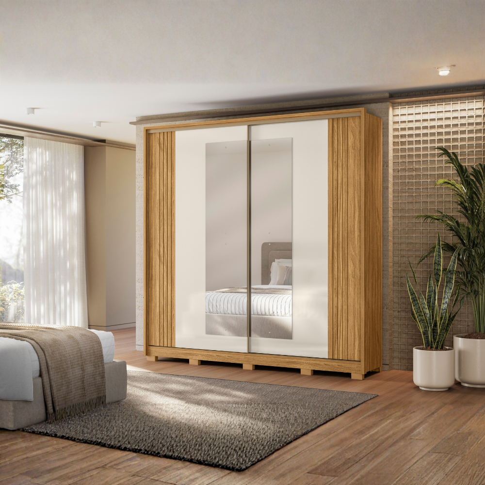 Guarda Roupa Dunas, a sofisticação e design que elevam o ambiente! Produzido em MDP de 12/ 15/ 25 mm (fundo em MDF de 2,5 mm) com acabamento em pintura UV. Possui portas de correr com abertura por trilho em alumínio, ambas com detalhes laterais em frisos de baixo relevo, espelhos centralizados, puxadores perfil em alumínio e sistema anti empenamento. Dispõe ainda de amplo espaço interno, com gavetas com corrediças telescópicas, maleiro espaçoso, prateleiras e nichos, além de cabideiro e calceiro em alumínio. Kit pés em plástico incluso, montagem opcional. Produto será entregue em 5 volumes.