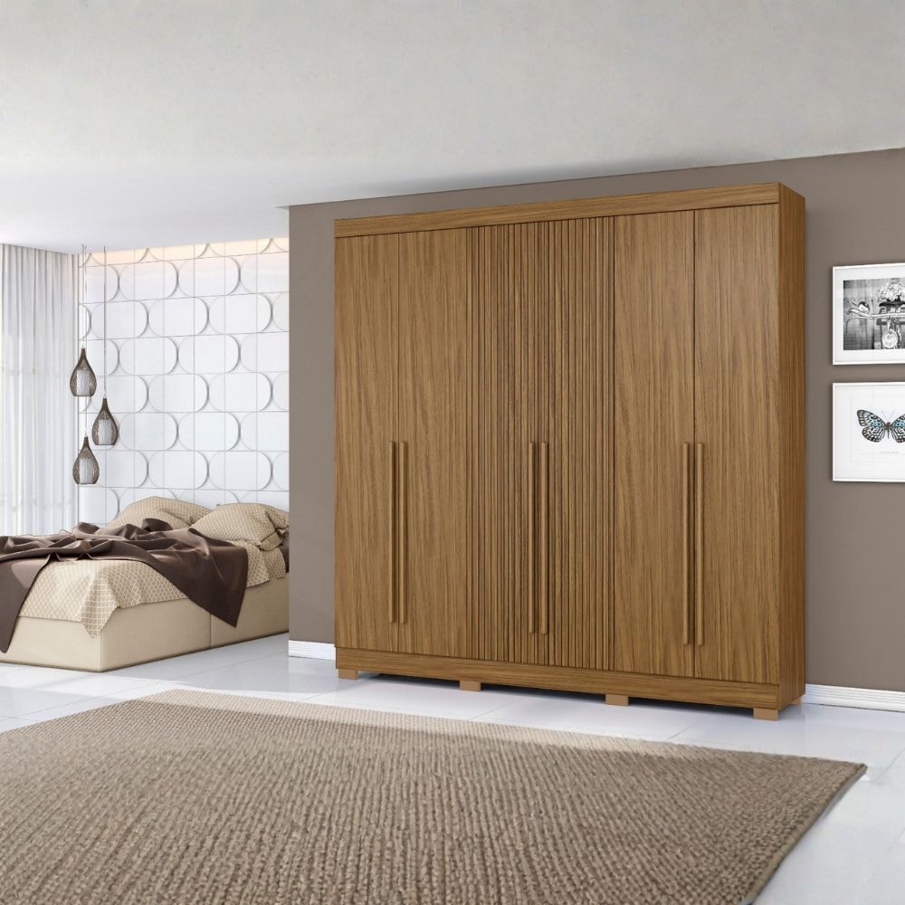 Guarda Roupa Casal 2030230, traz modernidade e praticidade ao armazenar seu vestuário. Conta com estrutura em MDP de 15 e 12 mm com acabamento UV texturizado. Composto por portas com dobradiças metálicas e puxadores em MDF 25mm, interna com amplo espaço de armazenamento, gavetas (suportando até 3kg cada) com corrediças telescópicas, cabideiros em madeira revestida (inferior sendo um calceiro) e prateleiras que suportam até 5kg cada, além de espaço para acomodar sapatos. Produto será entregue em 3 volumes.