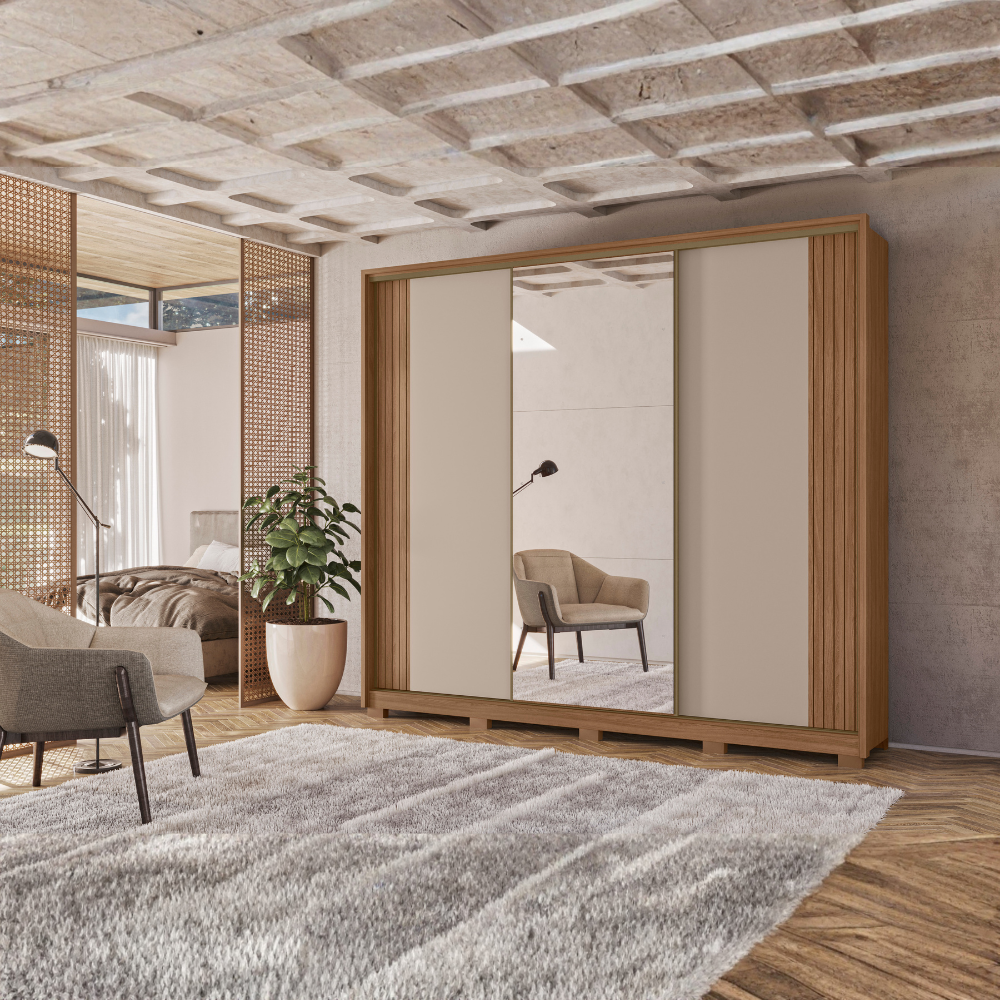 Guarda Roupas Nevada, design atual que combina praticidade e organização para o seu dia a dia! Produzido em MDP de 12/ 15 mm com moldura de 25 mm (fundo em MDF de 2,5 mm), com acabamento em pintura UV. Conta com portas de correr com abertura por trilho em alumínio, sistema anti empenamento, puxadores perfil em alumínio e portal central com espelho de 3 mm (69X84 cm). Sua interna de amplo espaço equipado por gavetas com corrediças telescópicas, múltiplas prateleiras e nichos, maleiro espaçoso, espaço para alçados e cabideiros/ calceiro em alumínio. Kit pés em plástico incluso, montagem opcional. Produto será entregue em 6 volumes.