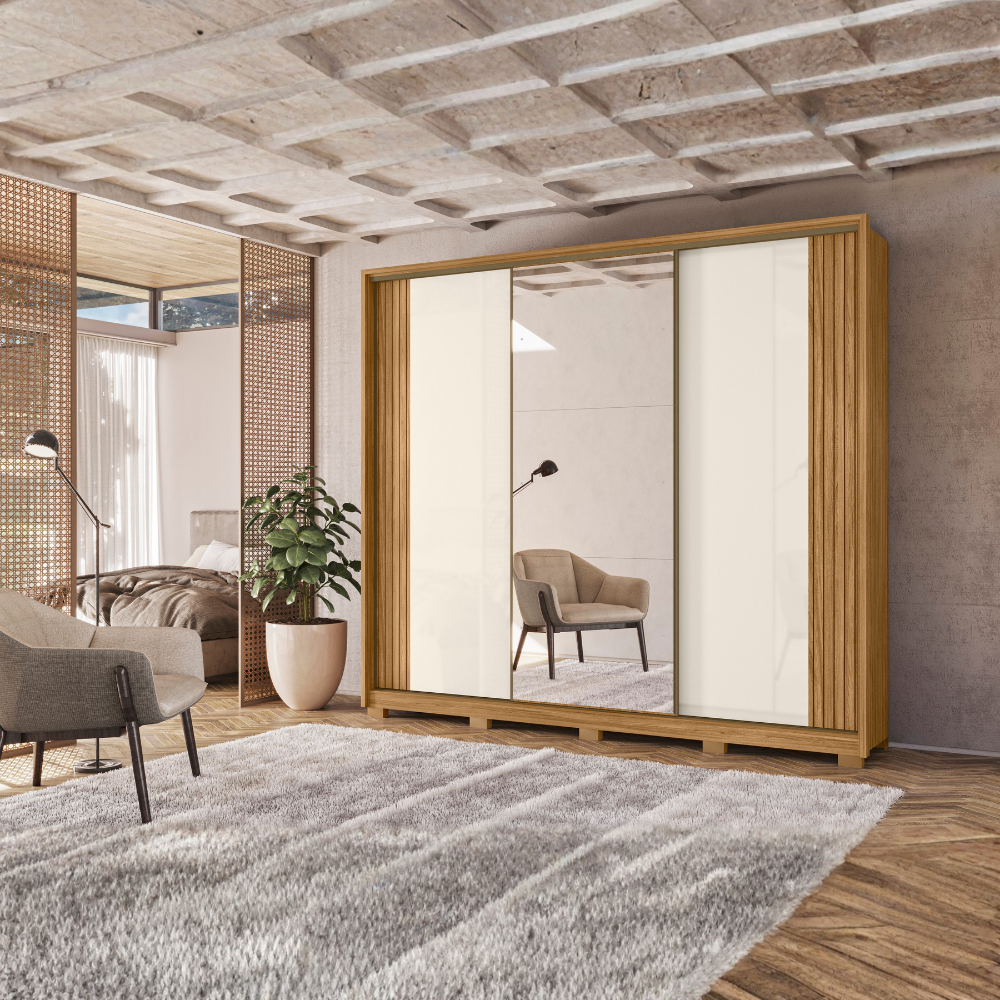 Guarda Roupa Casal 3 Portas De Correr 260 cm Com Espelho Nevada Freijo Off White Moval