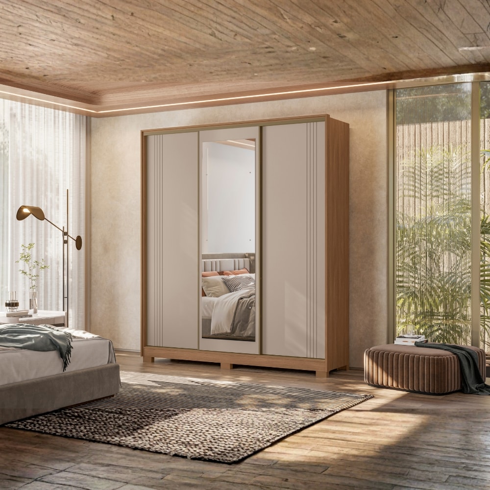 Guarda Roupa Casal Dallas, moderno e espaçoso, aliando estilo e funcionalidade ao seu dia a dia! Estrutura em MDP de 12/ 15 mm (fundo MDF 3 mm) com acabamento em pintura UV. Possui portas de correr com abertura por trilho em alumínio e anti empenamento, laterais com detalhes em friso de baixo relevo e central com espelhos de 3 mm (60X50 cm). Sua interna espaçosa é composta por gavetas com corrediças telescópicas, amplas prateleiras, espaço para calçados e cabideiros superiores em alumínio. Kit pés inclusos (em plástico), montagem opcional (conforme preferência do cliente). Produto será entregue em 4 volumes.