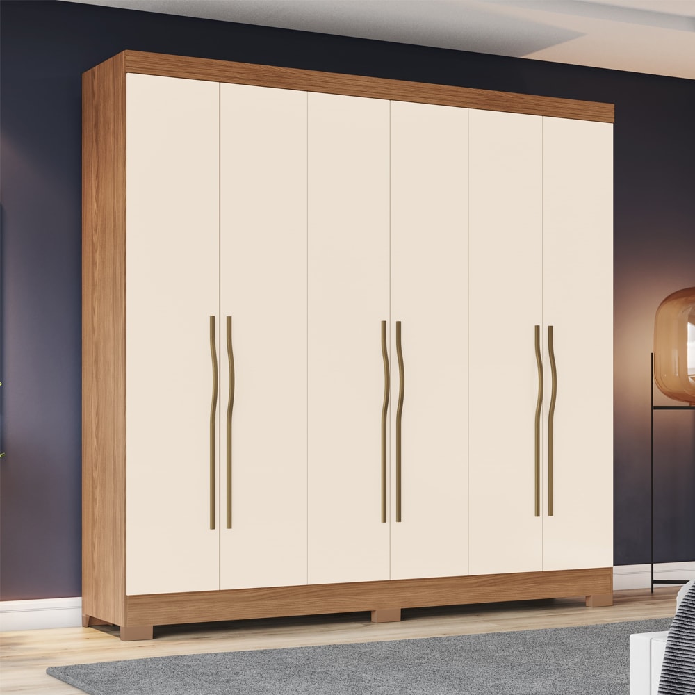 Guarda-roupa Casal B368, com foco em aproveitamento e organização! Produzido em MDP/MDF de 12 mm (fundo de 3 mm) com pintura UV texturizada. Conta com portas com dobradiças metálicas e puxadores em ABS, gavetas com corrediças metálicas e prateleiras internas que suportam até 8 kg cada. O móvel conta também com 6 pés em ABS com 5 cm de altura, oferece amplo espaço nos cabideiros (sendo 2 calceiro) e possui chapéu com detalhe em frisos (baixo relevo). Produto será entregue em 02 volumes.