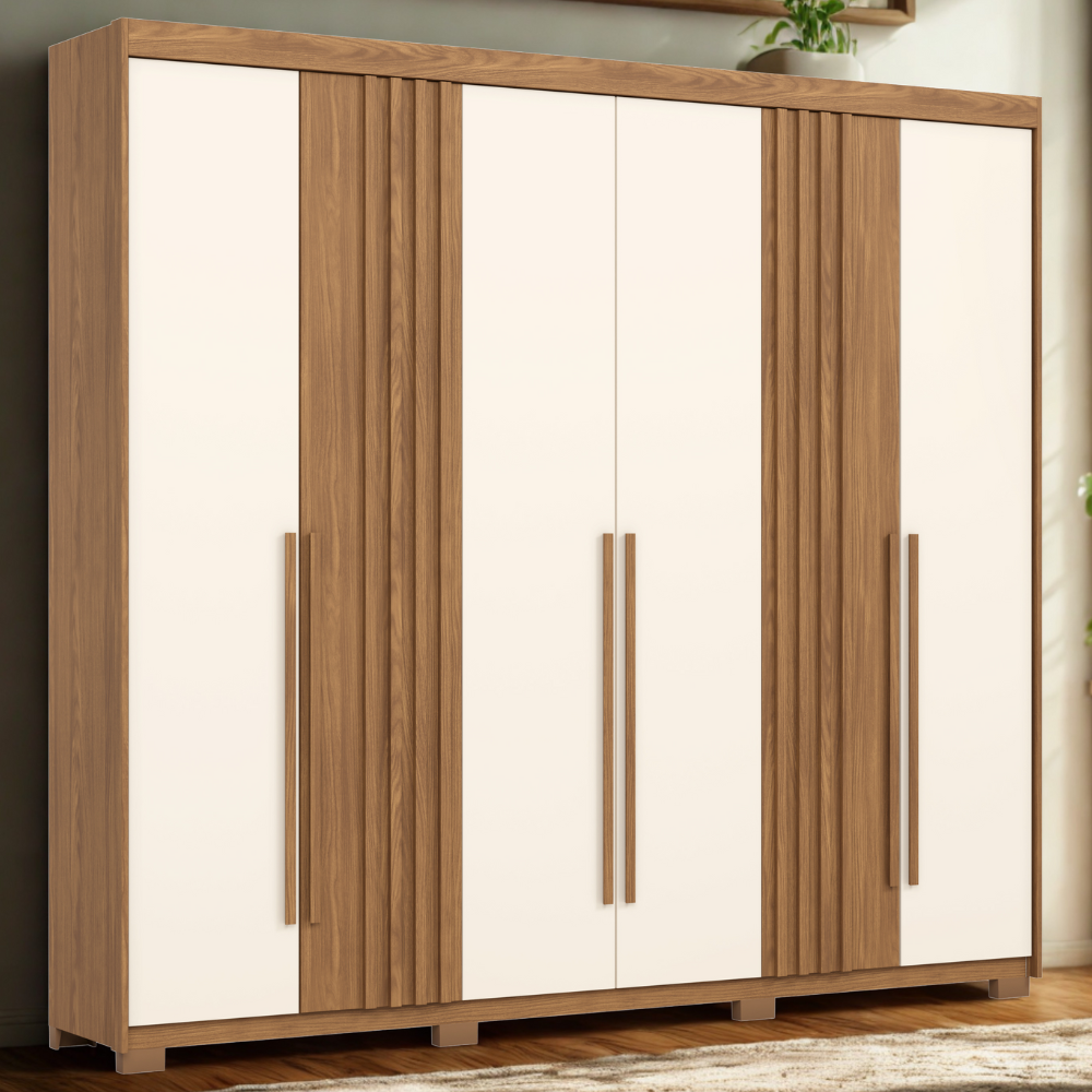 O Guarda Roupa Norton é ideal para manter a organização e praticidade do seu quarto! Produzido em MDP de 15/25 (fundo em MDF 3 mm) com pintura UV texturizada. Possui portas com dobradiças metálicas e puxadores em MDF revestidos, gavetas internas com corrediças telescópicas, amplas prateleiras internas, cabideiros/calceiro em alumínio (inferiores e superiores), maleiro interno, além de pés ABS. Conta com 2 portas de Design flex, contém aplique ripado (em MDF 12 mm) de alto relevo, podendo escolher a posição das mesmas durante a montagem. Produto será entregue em 03 volumes.