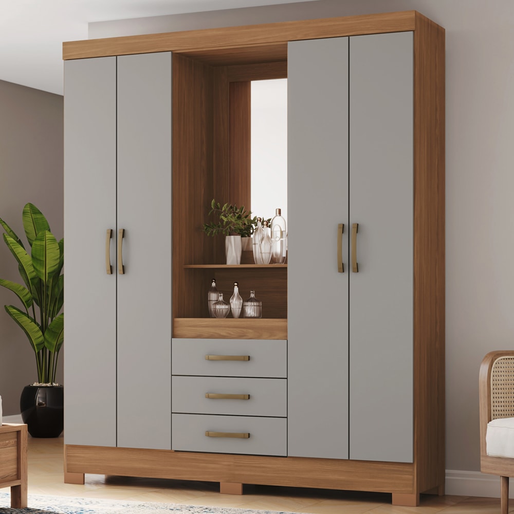Guarda-roupa Casal B24, um móvel que contribui para um ambiente mais organizado e harmonioso. Produzido em MDP/MDF de 12/15 mm (fundo 3 mm) com pintura UV texturizada. Conta Capelinha central com espelho e prateleira inferior, portas com dobradiças metálicas, gavetas com corrediças metálicas, puxadores em ABS e cabideiro de madeira. As prateleiras suportam até 8 kg cada e o móvel acompanha 8 pés em ABS com 5 cm de altura. Medidas do espelho com moldura (75 x 40 x 0,3). Produto será entregue em 02 volumes.