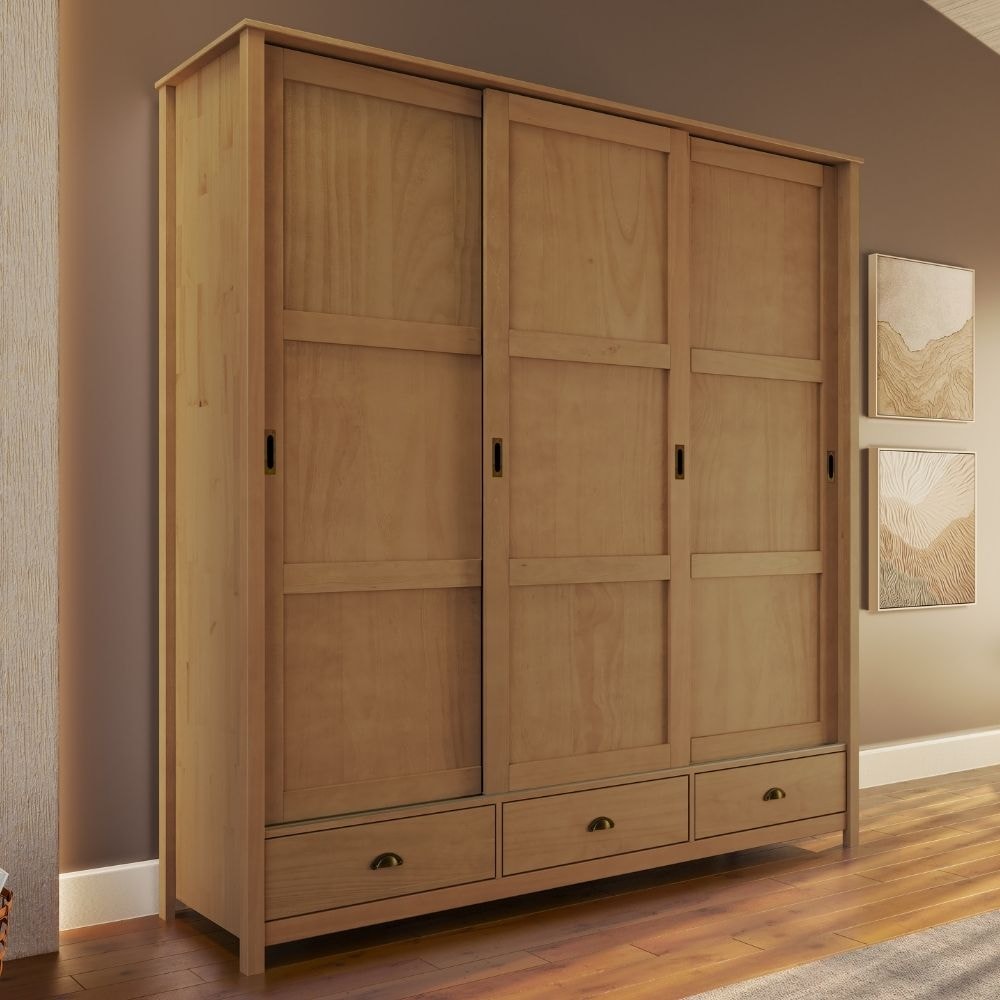 Guarda Roupa Casal Topázio, com presença sofisticada e robusta que envolve o quarto perfeitamente! Sua estrutura é 100% em Madeira Maciça Taeda (presença calorosa, toque orgânico) com espessura de 16 mm e acabamento em pintura brilho 5%. Composto por base com chapéu de 16 mm, portas de correr com detalhes emoldurado, puxadores metálicos (cor ouro envelhecido) e abertura por trilho de alumínio, conta também com amplas prateleiras e maleiro superior interno, cabideiros em alumínio e 3 gavetas externas, todas equipadas com corrediças telescópicas e puxadores metálicos estilo concha (cor ouro envelhecido). Além de pés alongados que acompanham toda sua estrutura, também em Madeira Maciça 16 mm. Produto será entregue em 03 volumes.