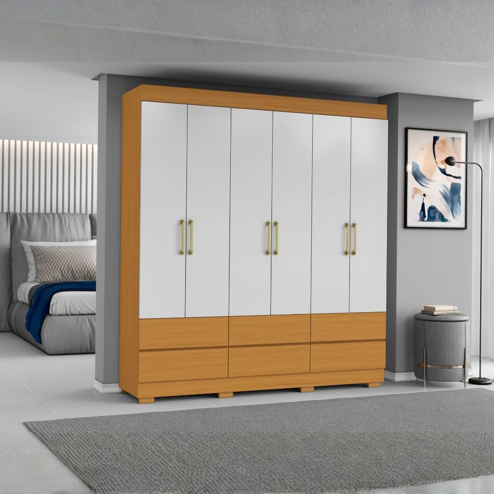 Guarda Roupa de Casal Marrocos, traz praticidade e modernidade a sua rotina. Conta com estrutura em MDP de 12 e 15 mm com acabamento UV texturizado. Composto por gavetas amplas (suportando até 3kg cada) com corrediças telescópicas, puxadores em PVC, cabideiro em madeira revestido e ótimo espaço interno para armazenamento, incluindo nichos suportando até 5kg cada. Produto será entregue em 2 volumes.