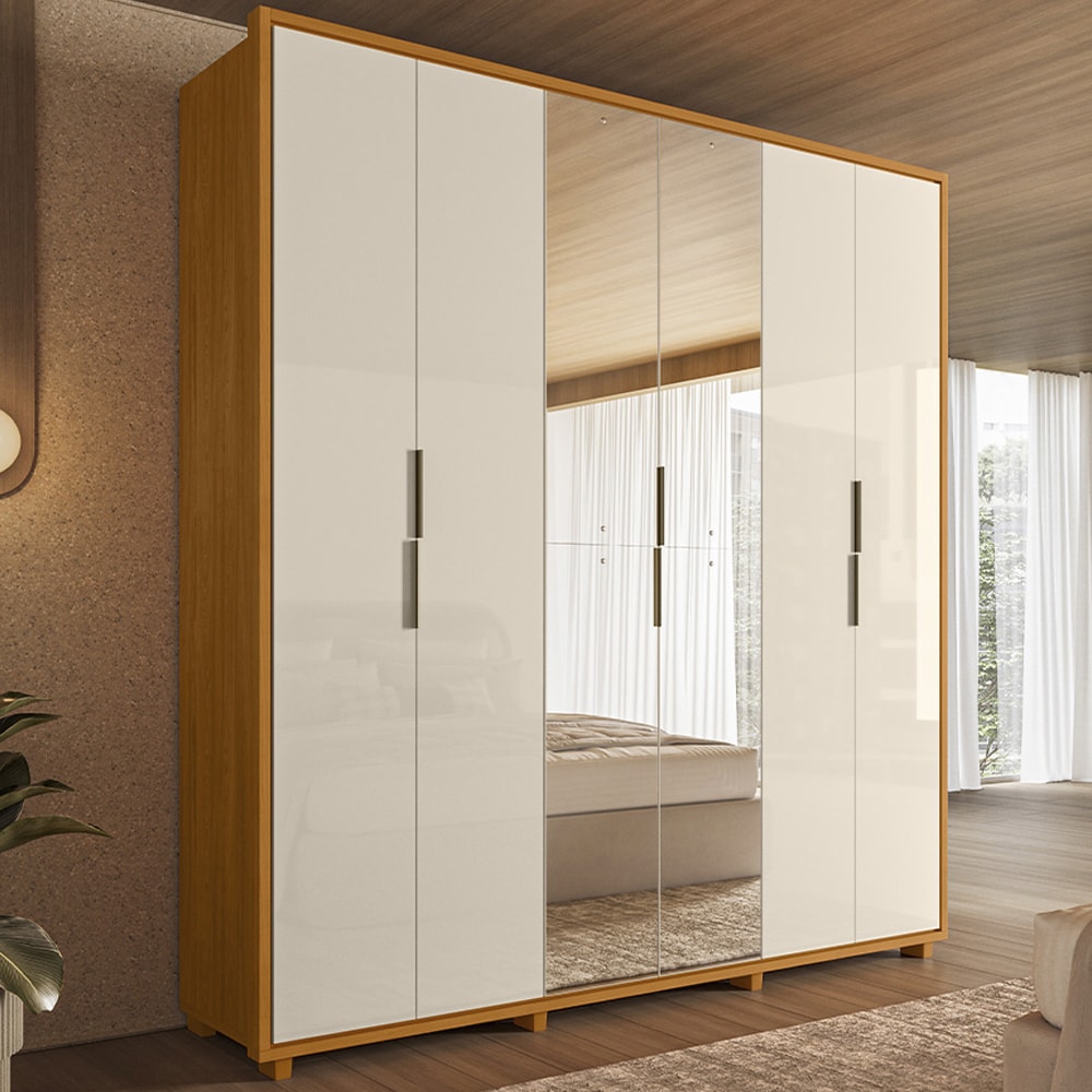 O Guarda Roupa Casal Matisse une funcionalidade e modernidade para deixar seu ambiente mais elegante! Estrutura 100% MDF 15/25 mm e acabamento em pintura UV. Possui portas com dobradiças metálicas e amortecimento, puxadores em metal (portas centrais com espelhos). Conta também com gavetas de corrediças telescópicas, amplos nichos para armazenamento e cabideiros internos, sendo o superior extensível com pistão a gás. NÃO ACOMPANHA OBJETOS NEM DEMAIS DECORAÇÕES. Este produto será entregue em 6 volumes.
