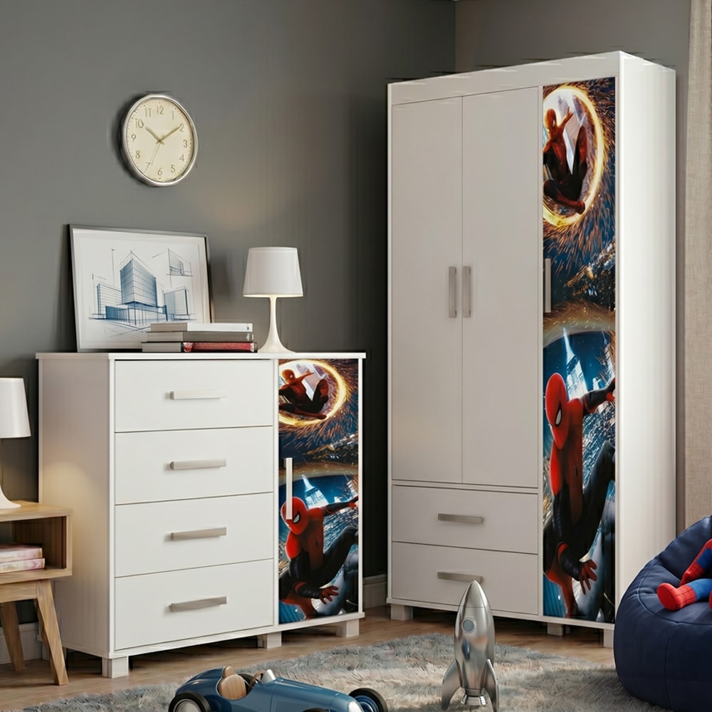 Guarda Roupa e Cômoda Lívia, uma organização que traz leveza para a rotina dos pequenos! Compostos por estrutura 100% MDF e acabamento em Verniz Brilho. O Guarda Roupa conta com portas com dobradiças metálicas e puxadores PVC, nichos laterais internos (suportando até 5 kg cada), prateleira central para armazenamento, gavetas com corrediças telescópicas e cabideiro superior. A cômoda conta com um tampo amplo e espaçoso, prateleira interna (suportando até 3 kg distribuídos), gavetas com corrediças telescópicas, e porta lateral com dobradiças metálicas, além de puxadores PVC. Ambas destacam-se pelo design alegre e temático com acabamento em Adesivo Temático anti risco. NÃO ACOMPANHA OBJETOS NEM DEMAIS DECORAÇÕES. Este produto será entregue em 2 volumes.