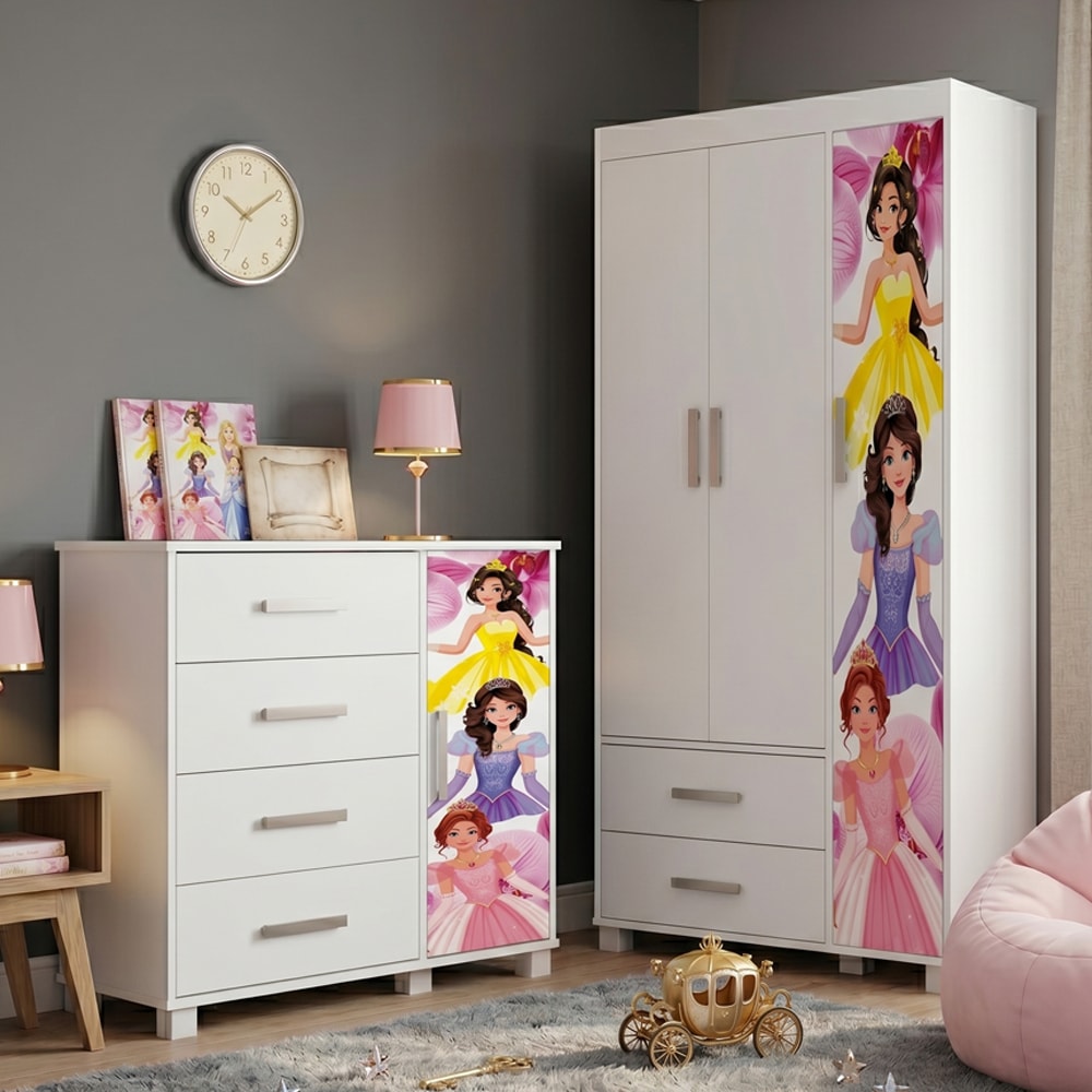 Guarda Roupa Infantil 3 Portas 2 Gavetas e Comoda 4 Gavetas 1 Porta MDF Livia Princesas Decmade