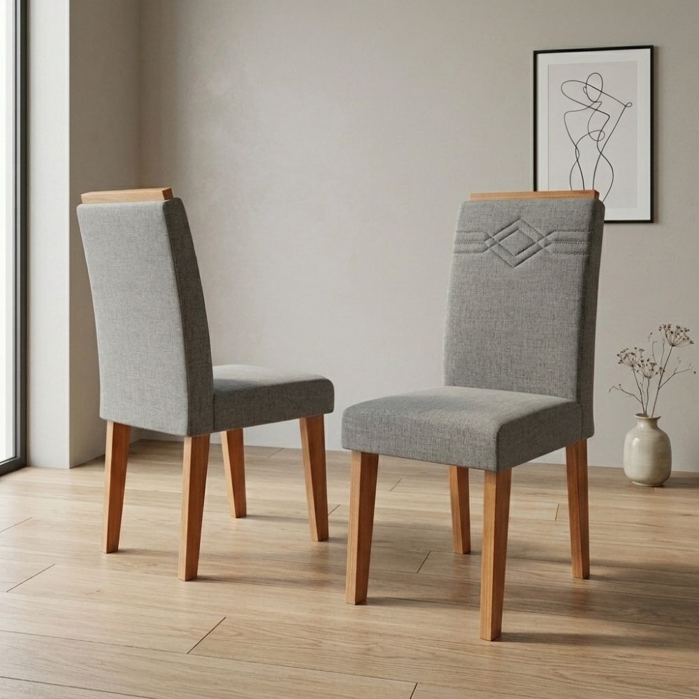 Cadeiras Taís, perfeitas para quem deseja aliar beleza, comodidade e funcionalidade em uma peça que eleva a decoração ambiente. Com estrutura em MDF de 15 mm (espaldar 25 mm) e acabamento em Pintura UV (semi brilho). Assento e encosto estofados em espuma de alta densidade (7,4 e 11 cm de espessura) e revestidos em tecido Linho (texturizado e moderno). Destaca-se por seu encosto com detalhe em costura bordada losangular. Além de pés em MDF com 25 mm de espessura. Cada cadeira suporta até 100 kg. Conjunto será entregue em 02 volumes.