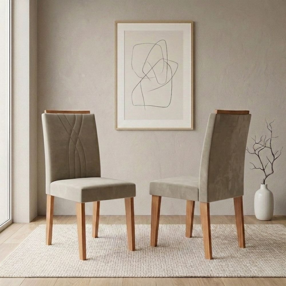 Cadeiras Nicole, idealizadas para oferecer um equilíbrio impecável entre estética, conforto e praticidade. Com estrutura em MDF de 15 mm (espaldar 25 mm) e acabamento em Pintura UV (semi brilho). Assento e encosto estofados em espuma de alta densidade (7,4 e 11 cm de espessura) e revestidos em tecido Suede (macio e aveludado). Destaca-se por seu encosto com detalhe em costura bordada cruzada. Além de pés em MDF com 25 mm de espessura. Cada cadeira suporta até 100 kg. Conjunto será entregue em 02 volumes.
