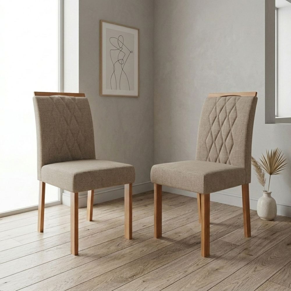 Cadeiras Juliana Wood, pensado para oferecer uma experiência completa em elegância, conforto e uso funcional. Com estrutura 100% Madeira Maciça Tauari de 25 mm (espaldar 20 mm) com acabamento em Verniz (semi brilho). Assento e encosto estofados em espuma de alta densidade e revestidos em tecido Linho (texturizado e moderno). Destaca-se por seu encosto com detalhe em costura bordada em padrão losangular e espaldar usinado moderno de cantos arredondados. Cada cadeira suporta até 100 kg. Conjunto será entregue em 01 volume.