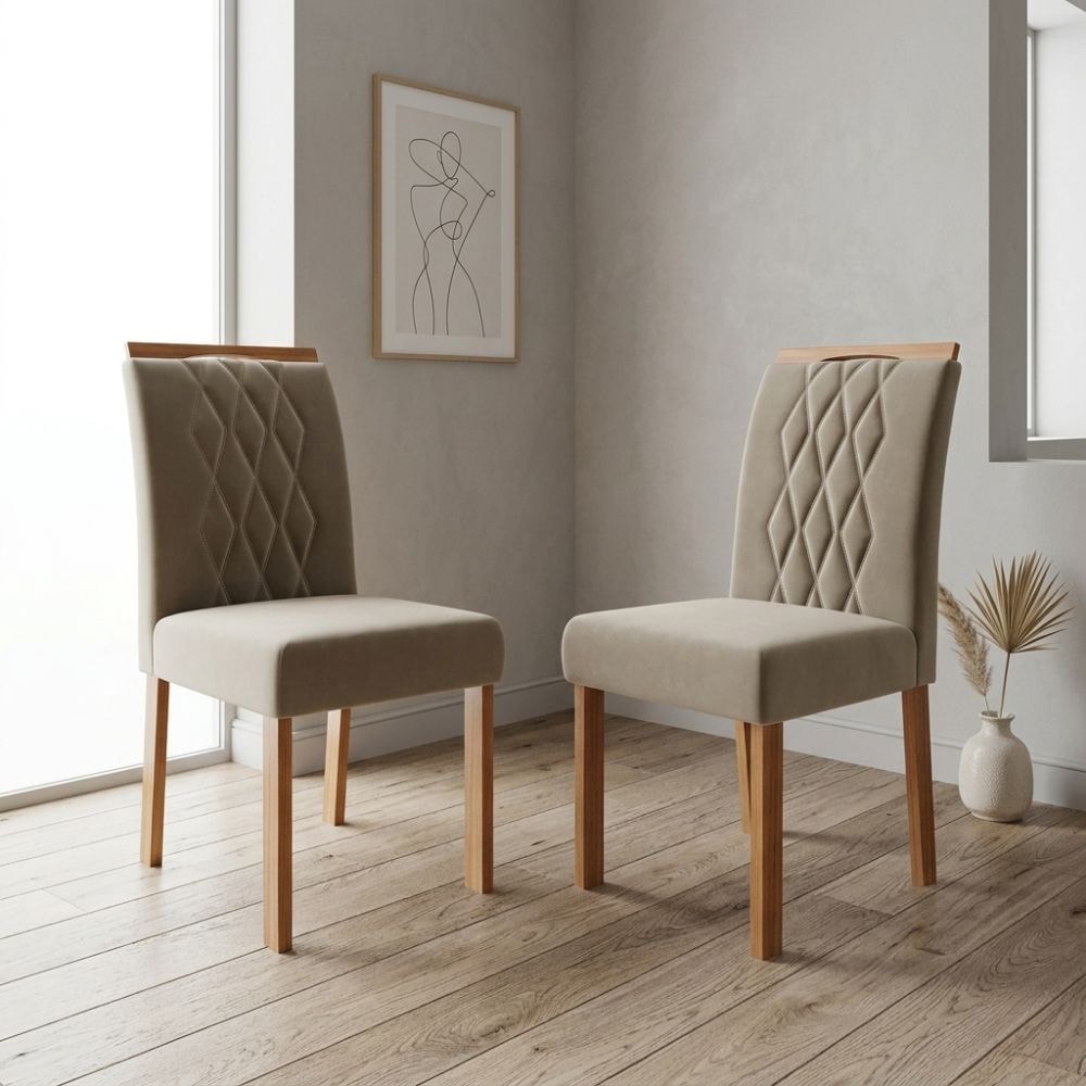 Cadeiras Juliana Wood, pensado para oferecer uma experiência completa em elegância, conforto e uso funcional. Com estrutura 100% Madeira Maciça Tauari de 25 mm (espaldar 20 mm) com acabamento em Verniz (semi brilho). Assento e encosto estofados em espuma de alta densidade e revestidos em tecido Suede (macio e aveludado). Destaca-se por seu encosto com detalhe em costura bordada em padrão losangular e espaldar usinado moderno de cantos arredondados. Cada cadeira suporta até 100 kg. Conjunto será entregue em 01 volume.