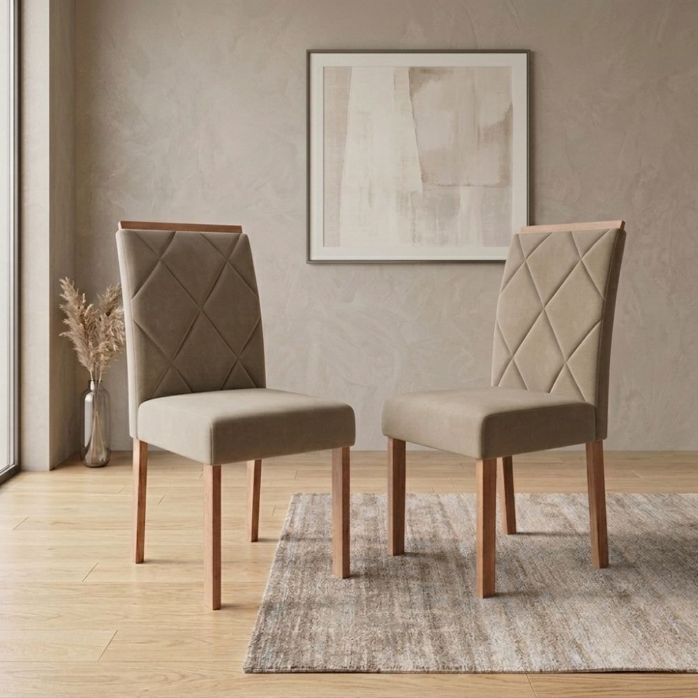 Cadeiras Fernanda Wood, a fusão perfeita entre elegância, conforto e praticidade. Com estrutura 100% Madeira Maciça Tauari de 25 mm (espaldar 20 mm) com acabamento em Verniz (semi brilho). Assento e encosto estofados em espuma de alta densidade e revestidos em tecido Suede (macio e aveludado). Destaca-se por seu encosto com detalhe em costura bordada diagonal. Cada cadeira suporta até 100 kg. Conjunto será entregue em 01 volume.