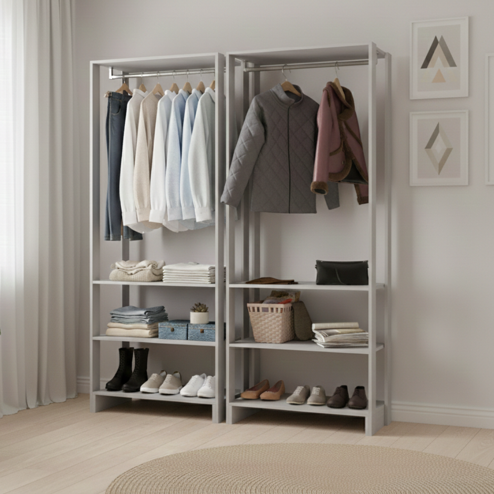 Closet Modulado IY101, conceito aberto para melhor aproveitamento de espaço e organização! Estrutura 100% MDP 15 mm, com acabamento em pintura UV (fosco). Composto por 2 módulos com amplas prateleiras para armazenamento de sapatos, bolsas e demais objetos, e cabideiros superiores em madeira revestida, funcional e ideal para o dia a dia. Produto entregue em 4 volumes.