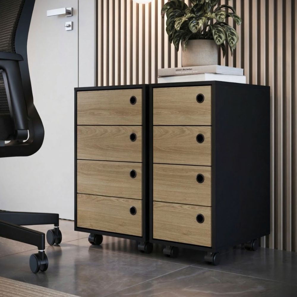 Kit com 2 Gaveteiros Multiuso P1072, versáteis e ideais para compor seu escritório. Possuem estrutura em MDP 15 mm e acabamento FF (Finish Foil - Fosco). Compostos por gavetas com corrediças metálicas (suportando até 5kg cada) com puxadores circulares em plástico, além de rodízios para melhor locomoção. Produto será entregue em 02 volumes.