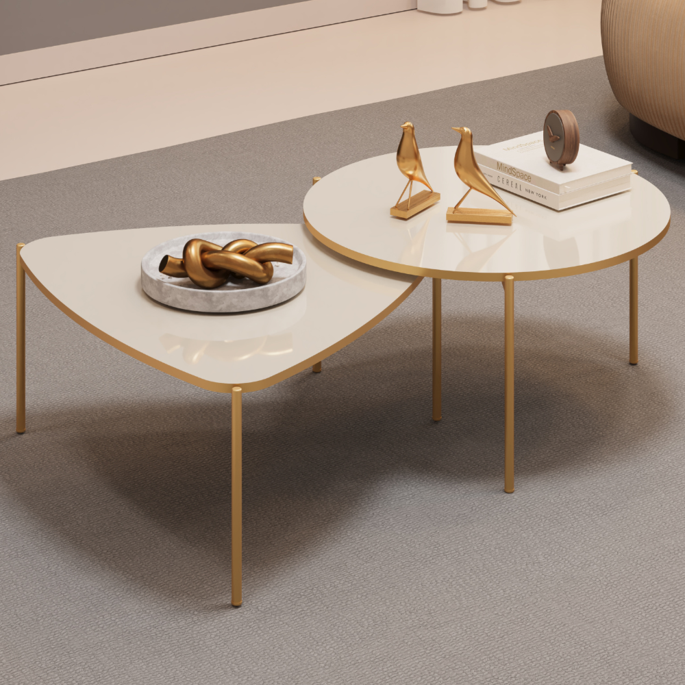 Mesas de Centro Lina e Cleia, o conjunto com design moderno e estilo orgânico que complementam sua sala de estar. Estrutura em MDF com acabamento em pintura UV texturizada (bordas em pintura PU) e pés em metal (pintura epóxi). Possuem tampos usinados (redondo e triangular), bordas arredondados e pés em formato cilíndrico. Este conjunto será entregue em 4 volumes.