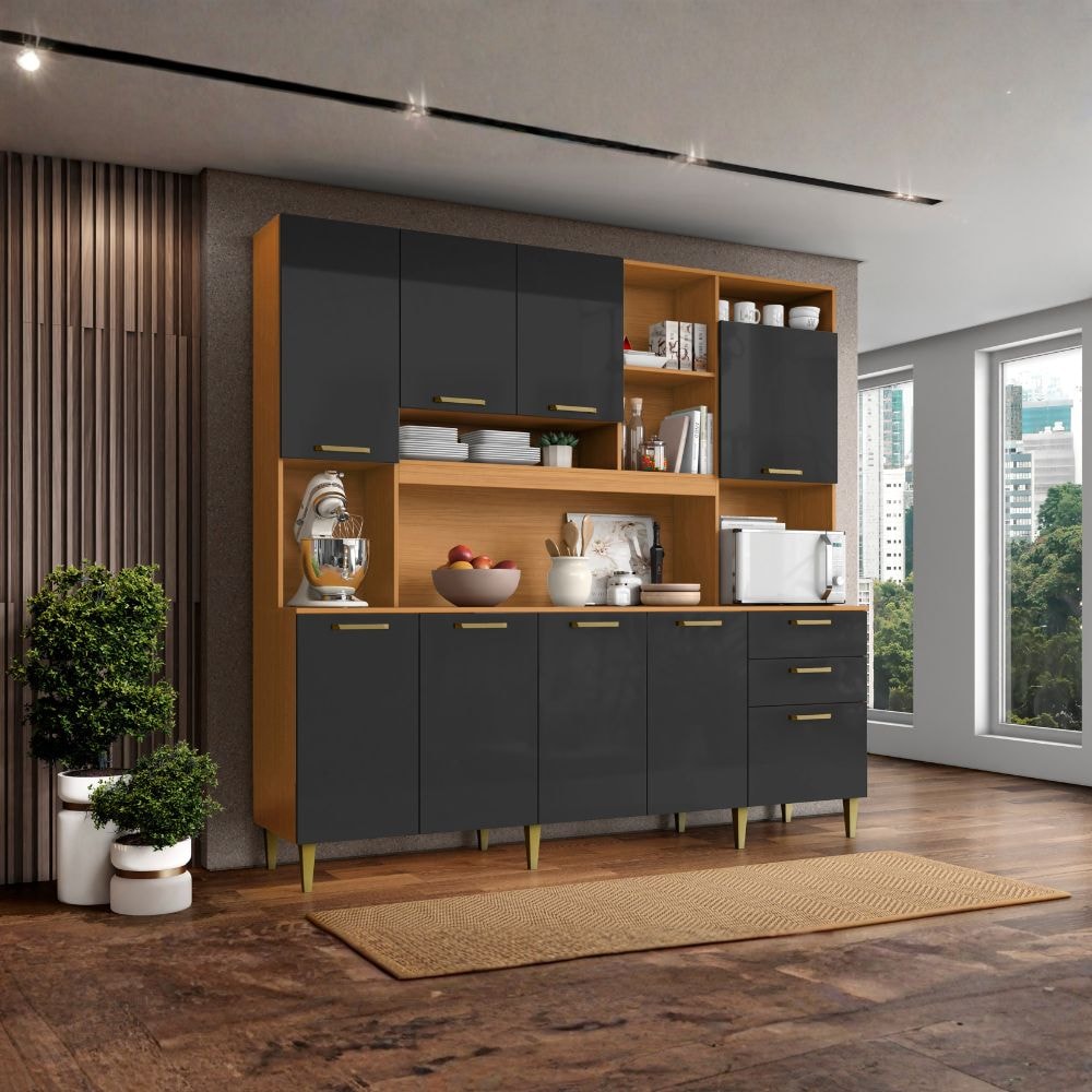 Kit Cozinha Mega, sofisticada e ideal para trazer praticidade e elegância a sua cozinha. Estrutura em MDP e MDF de 3/12/15mm com acabamento em verniz de alto-brilho. Possui múltiplas portas com dobradiças metálicas, gavetas com corrediça metálica e diversas prateleiras internas (suportando até 4kg cada). Conta ainda com espaço amplo para eletrodomésticos, pés e puxadores em plástico. Produto será entregue em 03 volumes.