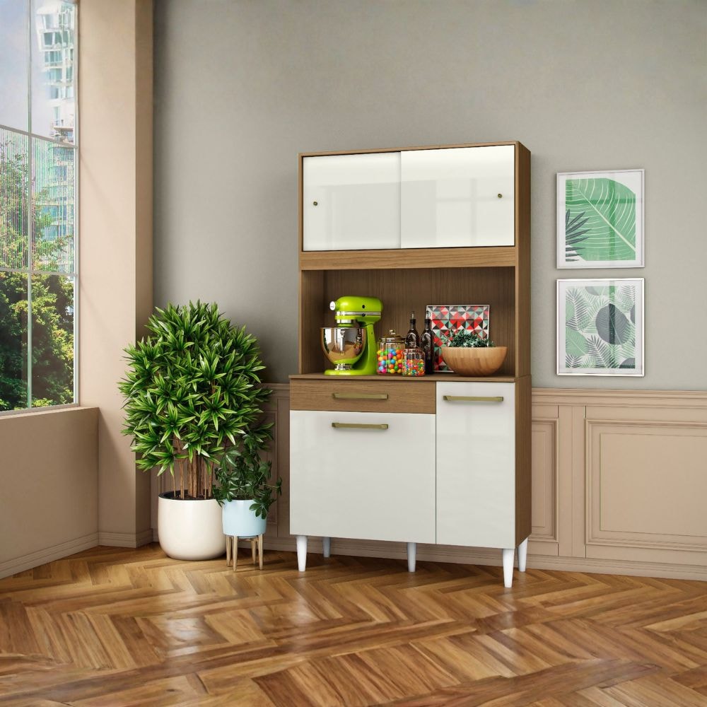 Kit Cozinha 2004306, moderna, compacta e prática, pensada para sua rotina na cozinha. Estrutura em MDP de 12 e 15mm com acabamento em verniz de alto-brilho e fosco. Possui portas com dobradiças metálicas, gaveta com corrediça metálica e prateleiras internas (suportando até 5kg cada). Conta ainda com bom espaço para eletrodomésticos, puxadores e pés em plástico. Produto será entregue em 01 volume.
