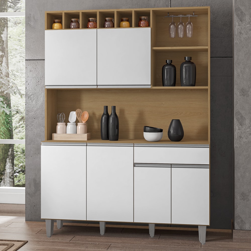 Kit Cozinha Alice, projetada para oferecer praticidade e elegância ao seu dia a dia. Produzida em MDP 12/15mm (fundo 3mm) com acabamento em pintura UV. Conta com portas com dobradiças metálicas, gaveta única com corrediças também metálicas, nichos e adega superior, além de um suporte porta taças metálico. Seus pés são em plástico com regulagem, enquanto os puxadores são em alumínio, promovendo estilo moderno a peça. Produto será entregue em 02 volumes.