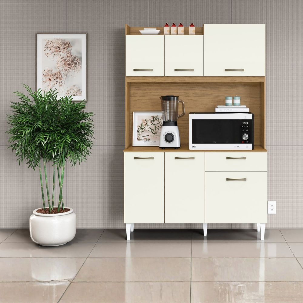 Kit Cozinha Berlim, compacta, moderna e perfeita para trazer praticidade a sua rotina. Estrutura em MDP 12/15mm com acabamento em verniz fosco e de alto-brilho. Possui portas com dobradiças metálicas, gaveta com corrediça metálica e prateleiras internas (suportando até 5kg cada). Conta ainda com espaço amplo para eletrodomésticos, pés e puxadores em plástico. Produto será entregue em 01 volume.