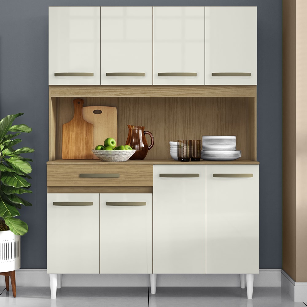 Kit Cozinha Compacta Cleo, design compacto e funcional para transformar sua sala de jantar. Estrutura em MDP (15/12 mm) e acabamento em Verniz. Possui 8 portas com puxadores em plástico, 1 prateleira interna, 1 gaveta com corrediças metálicas e 5 pés em plástico. Este produto será entregue em 1 volume.