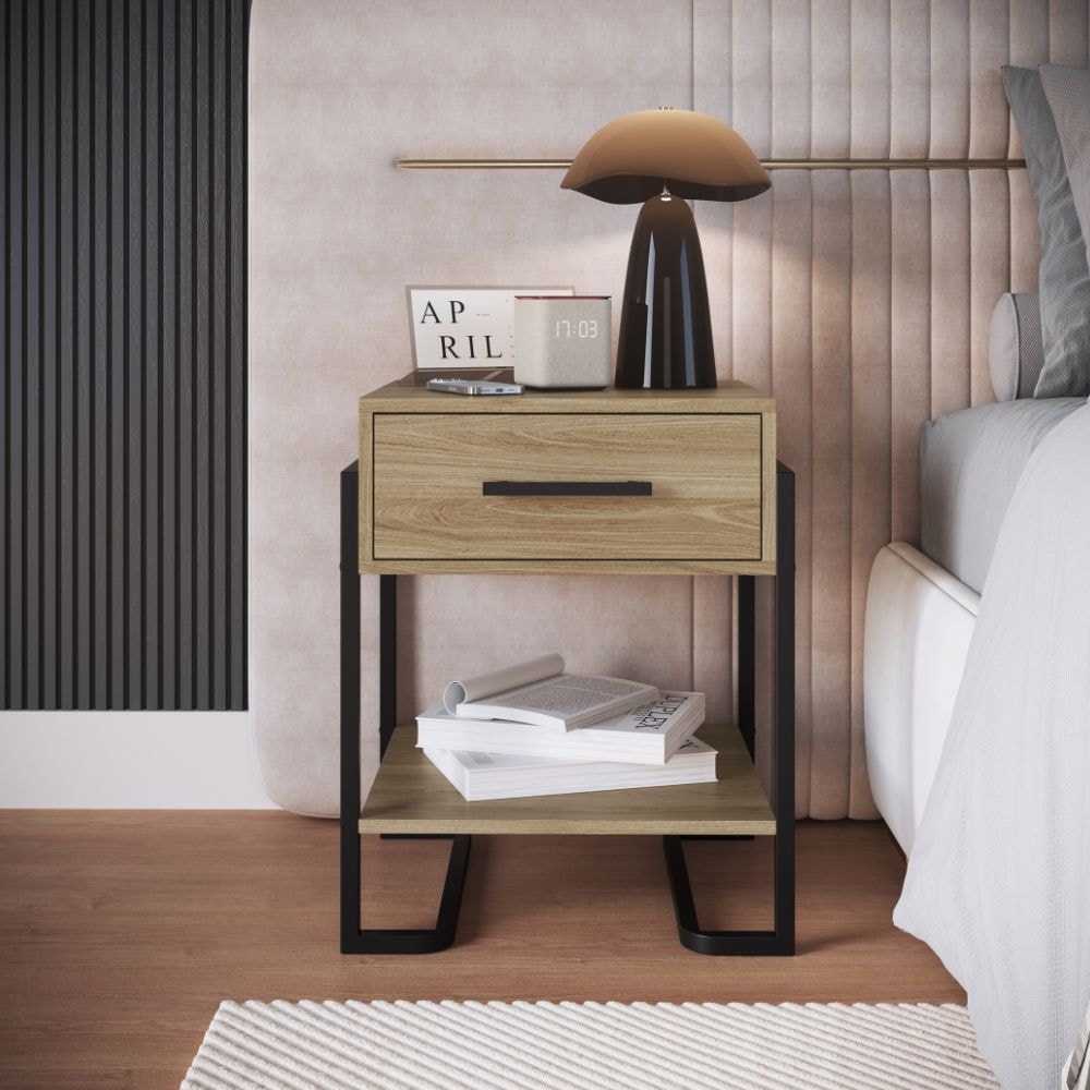 Mesa de Cabeceira P1059, com design moderno para complementar ao seu quarto. Conta com estrutura em MDP 12 mm e metal de 20 mm com pintura epóxi. Combina gaveta com corrediças metálicas (suporta até 3kg) e prateleira (suporta até 8kg) para uma organização versátil e eficiente. Possui puxadores em alumínio e pés em metal. Produto será entregue em 01 volume.