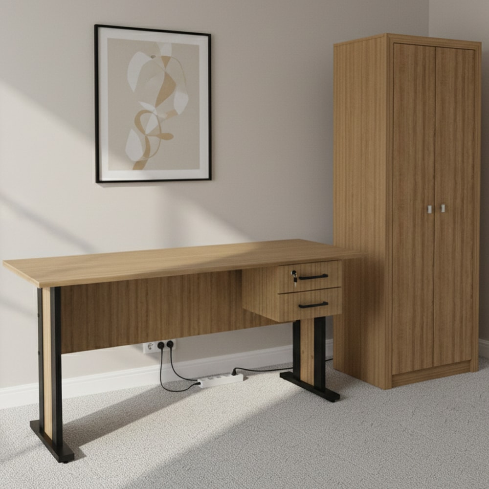 O conjunto ME4193XAM3113 traz estilo e funcionalidade deixando seu ambiente mais pratico e organizado, sendo fabricado com estrutura em madeira MDP de 15 mm, tampo em MDP de 25 mm e revestimento em material BP, com acabamento traseiro no mesmo padrão de cor e material, a Mesa para Escritório ME4193 conta com 02 gavetas que suportam até 3 kg cada, sendo uma delas com trava por chave, puxadores em metal e corrediças telescópicas, além de pés em madeira MDP de 25 mm com sapatas reguláveis, suportando até 21 kg, o Armário Multiuso conta com 02 portas, puxadores, dobradiças metálicas, sapatas, 03 prateleiras moveis e 05 prateleiras que suportam até 12 kg cada, além de amplo espaço interno que contribui para manter tudo organizado. NÃO ACOMPANHA CADEIRA NEM DEMAIS DECORAÇÕES. Este produto será entregue em 2 volumes.