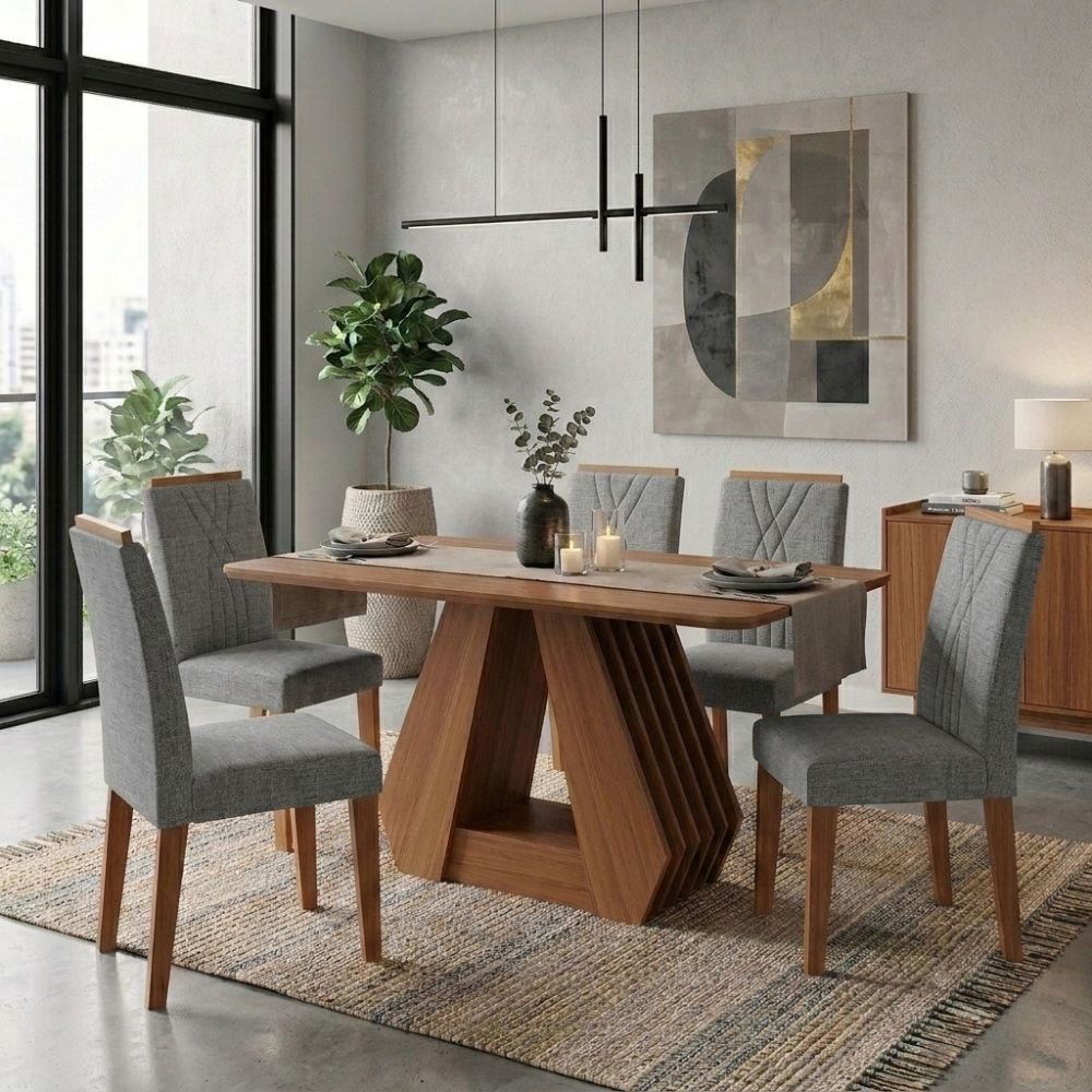 Mesa Ágata e Cadeiras Nicole, composição completa que une elegância, conforto e funcionalidade que elevam a sua sala de jantar! Ambas mesa e cadeira contam com estrutura em 100% em MDF de 15 e 25 mm com acabamento UV. A mesa inclui tampo retangular em MDF de 25 mm (TAMPO NÃO ACOMPANHA VIDRO) com bordas chanfradas, acabamento Laca e UV. Além de base com design triangular, detalhes ripados e sistema de fixação oculto. As cadeiras possuem assento e encosto estofados em espuma de alta densidade (7,4 e 11 cm de espessura), revestidos em tecido Linho (texturizado e moderno) com detalhes em costura bordada. Além de espaldar e pés em MDF de 20 e 25 mm. Conjunto será entregue em 06 volumes.