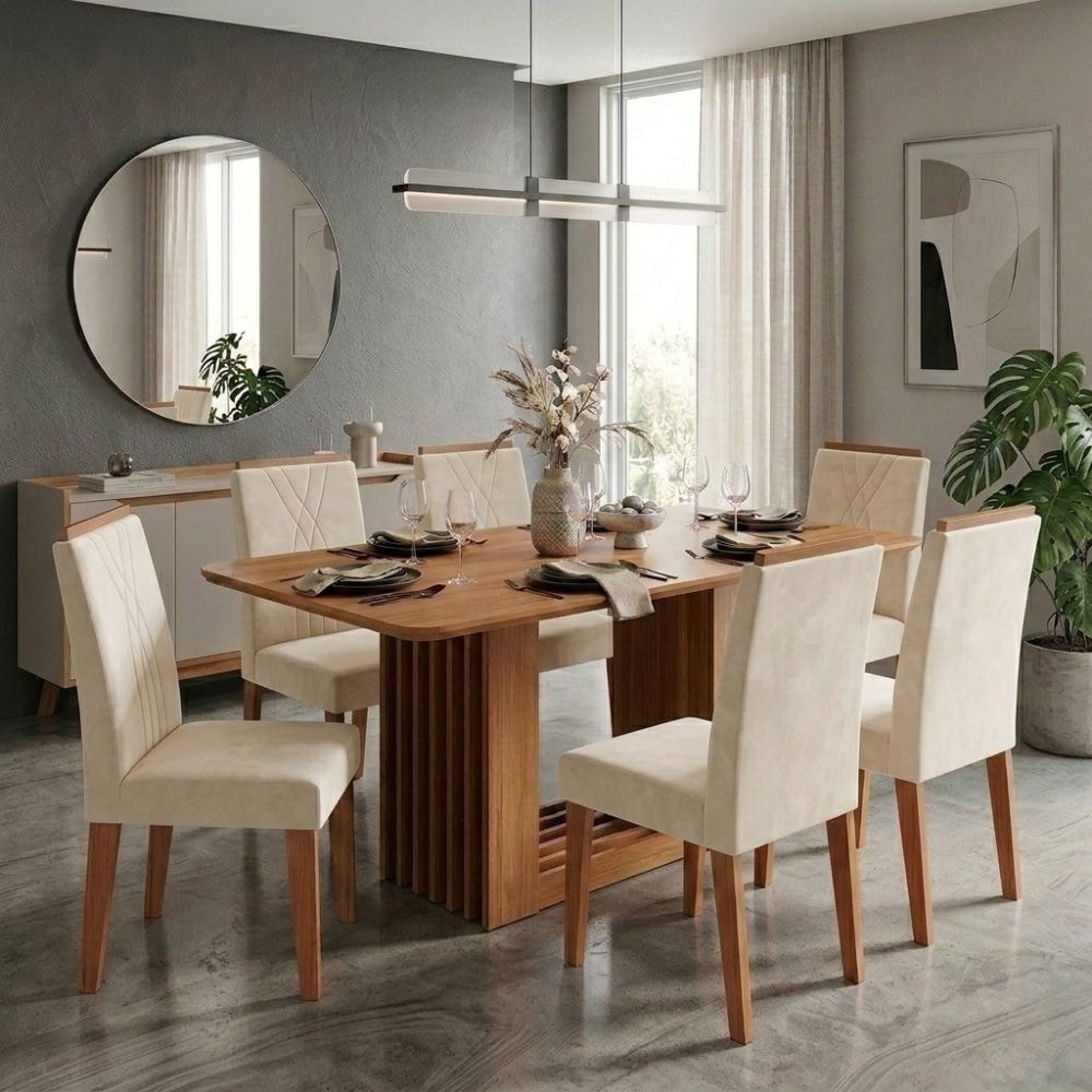 Mesa de Jantar Ariela MDF Com 6 Cadeiras Estofadas Suede Nude MOLCI