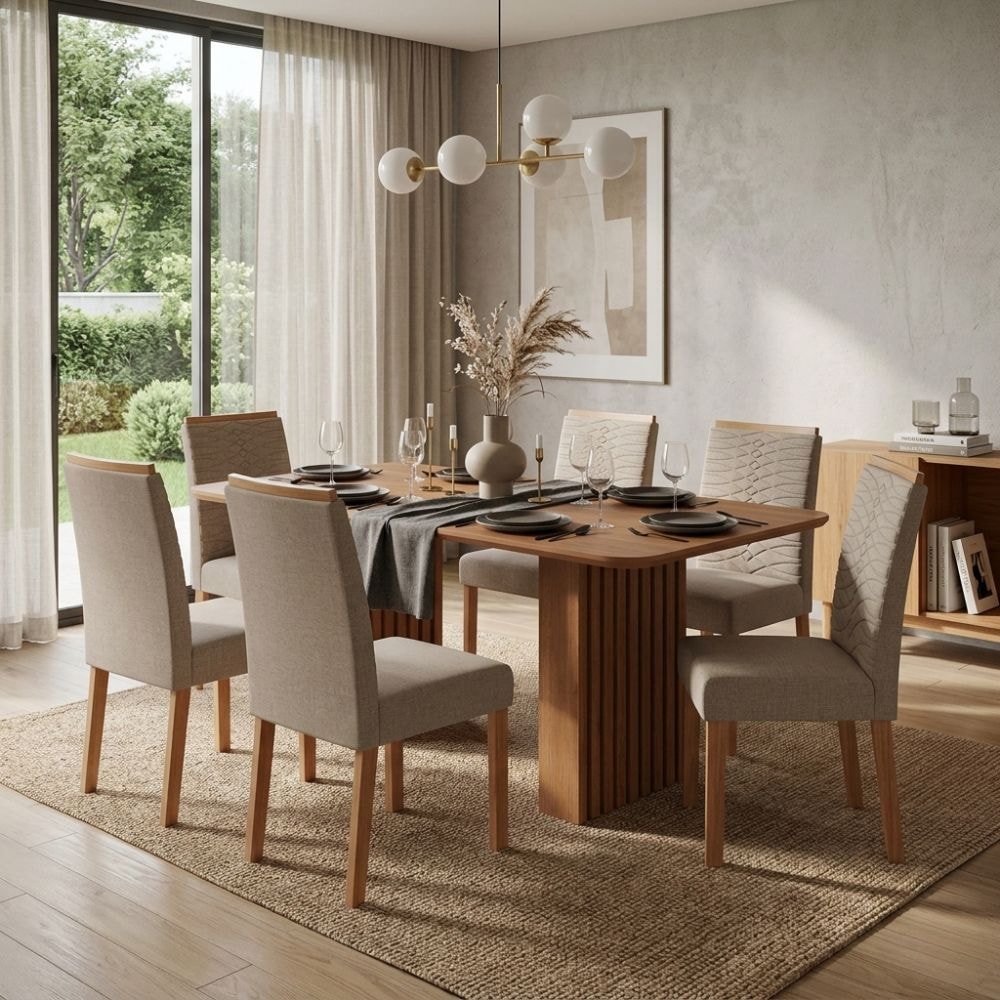Mesa Ester e Cadeiras Clarice, modernidade e funcionalidade que elevam seu ambiente com sofisticação! A mesa conta com estrutura em MDF de 12/25 e 35 mm com acabamento UV, enquanto as cadeiras são em Madeira Maciça Tauari com Verniz (Semi Brilho). A mesa inclui tampo retangular em MDF de 25 mm (TAMPO NÃO ACOMPANHA VIDRO) com acabamento Laca e UV, bordas chanfradas, além de base com detalhes ripados em alto relevo e sistema de fixação oculto. As cadeiras possuem assento e encosto estofados em espuma de alta densidade (7,4 e 11 cm de espessura), revestidos em tecido Linho (texturizado e moderno) com detalhes em costura bordada. Além de espaldar e pés em Madeira Tauari de 20 e 25 mm. Conjunto será entregue em 08 volumes.