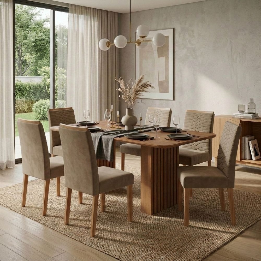 Mesa Ester e Cadeiras Clarice, modernidade e funcionalidade que elevam seu ambiente com sofisticação! A mesa conta com estrutura em MDF de 12/25 e 35 mm com acabamento UV, enquanto as cadeiras são em Madeira Maciça Tauari com Verniz (Semi Brilho). A mesa inclui tampo retangular em MDF de 25 mm (TAMPO NÃO ACOMPANHA VIDRO) com acabamento Laca e UV, bordas chanfradas, além de base com detalhes ripados em alto relevo e sistema de fixação oculto. As cadeiras possuem assento e encosto estofados em espuma de alta densidade (7,4 e 11 cm de espessura), revestidos em tecido Suede (macio e aveludado) com detalhes em costura bordada. Além de espaldar e pés em Madeira Tauari de 20 e 25 mm. Conjunto será entregue em 08 volumes.