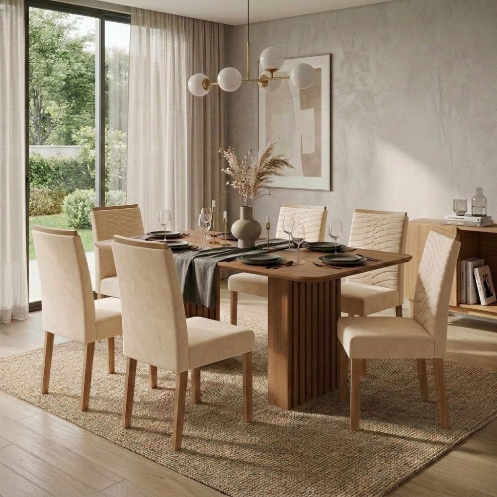 Mesa de Jantar Ester MDF Com 6 Cadeiras Estofadas Suede Nude MOLCI