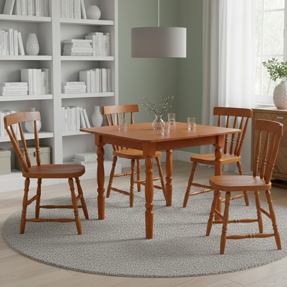 O Conjunto de Jantar 110150LB é a opção perfeita para transformar e valorizar seu lar! Com Mesa ampla acompanhada de 04 Cadeiras, compostas com Estrutura e pés em Madeira Maciça Eucalipto e tampo (mesa) em MDP revestido com lâmina de madeira espessura de 2,3 cm e bordas reforçadas de 3 cm, além de acabamento em verniz brilho. O design é valorizado pelo encosto e pés torneados, com 3,8 cm de largura, assentos com 2,3 cm de espessura, suportando até 120 kg cada. NÃO ACOMPANHA OBJETOS NEM DEMAIS DECORAÇÕES. Este produto será entregue em 3 volumes.