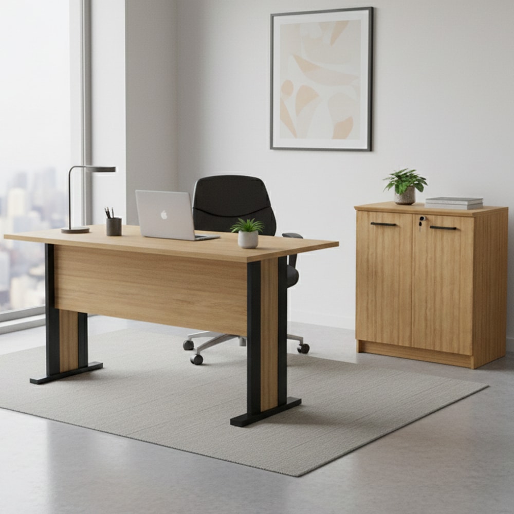 O conjunto ME4194XME4197 combina funcionalidade e um visual moderno para transformar seu ambiente de trabalho, oferecendo uma solução prática e eficiente para manter tudo organizado, sendo fabricado com estrutura em madeira MDP de 15 mm, tampo em MDP de 25 mm e revestimento em material BP, com acabamento traseiro no mesmo padrão de cor e material, a Mesa Escrivaninha ME4194 conta com pés em madeira MDP de 25 mm e sapatas reguláveis suportando até 12 kg, proporcionando uma solução funcional para manter o espaço de trabalho organizado, já o Balcão para Escritório ME4197 conta com 02 portas, sendo 01 delas com trava por chave, 01 prateleira interna com capacidade para até 12 kg, dobradiças em metal e puxadores em alumínio. NÃO ACOMPANHA CADEIRA NEM DEMAIS DECORAÇÕES. Este produto será entregue em 2 volumes.