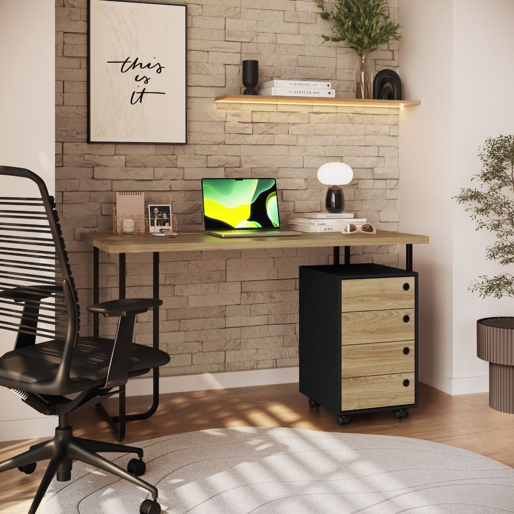 Um conjunto entre a mesa escrivaninha P1069 e o gaveteiro P1072, prático, moderno e a escolha perfeita para acomodar computadores, livros, decorações e outros para trabalho ou estudo. A mesa conta com estrutura em metal de 20 mm (pintura epóxi) e tampo em MDP 30 mm (acabamento FF - Finish Foil). O gaveteiro possui estrutura em MDP 15 mm e acabamento FF (Finish Foil - Fosco). Composto por gavetas com corrediças metálicas (suportando até 5kg cada) com puxadores circulares em plástico, além de rodízios para melhor locomoção. Produtos serão entregues em 02 volumes.