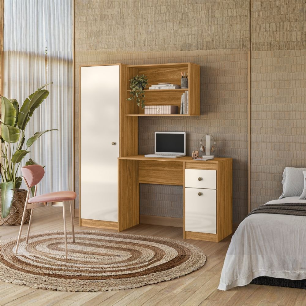 Mesa Escrivaninha Coimbra, organização e praticidade reunidas em um só móvel. Estrutura em MDP de 15 mm com acabamento em pintura UV. Conta com armário lateral com 1 porta e 4 prateleiras internas, além de nicho superior com prateleira, ideal para organização e apoio de itens, e módulo com 1 gaveta equipada com corrediças telescópicas, indicada para objetos menores. Possui puxadores em PVC na cor bronze. Demais itens decorativos não inclusos. Produto entregue em 2 volumes.