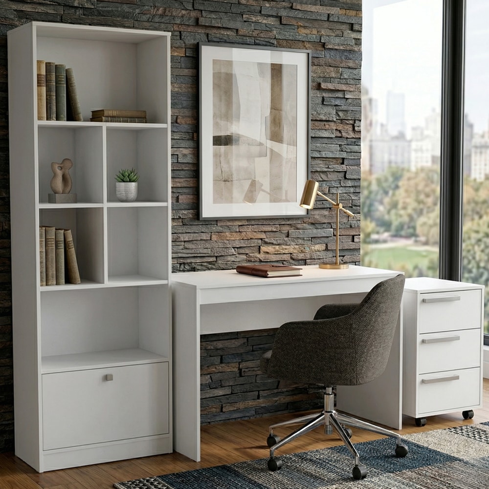 Conjunto de Escritório B31, prático e funcional, desenvolvido para facilitar sua rotina com estilo! Produzido em estrutura MDP de 15 mm e acabamento UV fosco. O Conjunto é composto por mesa escrivaninha com tampo amplo e espaçoso (Suportando até 20 kg distribuídos), estante livreiro com amplos nichos para armazenamento e porta inferior basculante com dobradiças metálicas, além de acompanhar um gaveteiro de 3 gavetas com corrediças metálicas, puxadores em plástico e rodízios para melhor locomoção. NÃO ACOMPANHA ELETRÔNICOS NEM DEMAIS DECORAÇÕES. Este produto será entregue em 3 volumes.