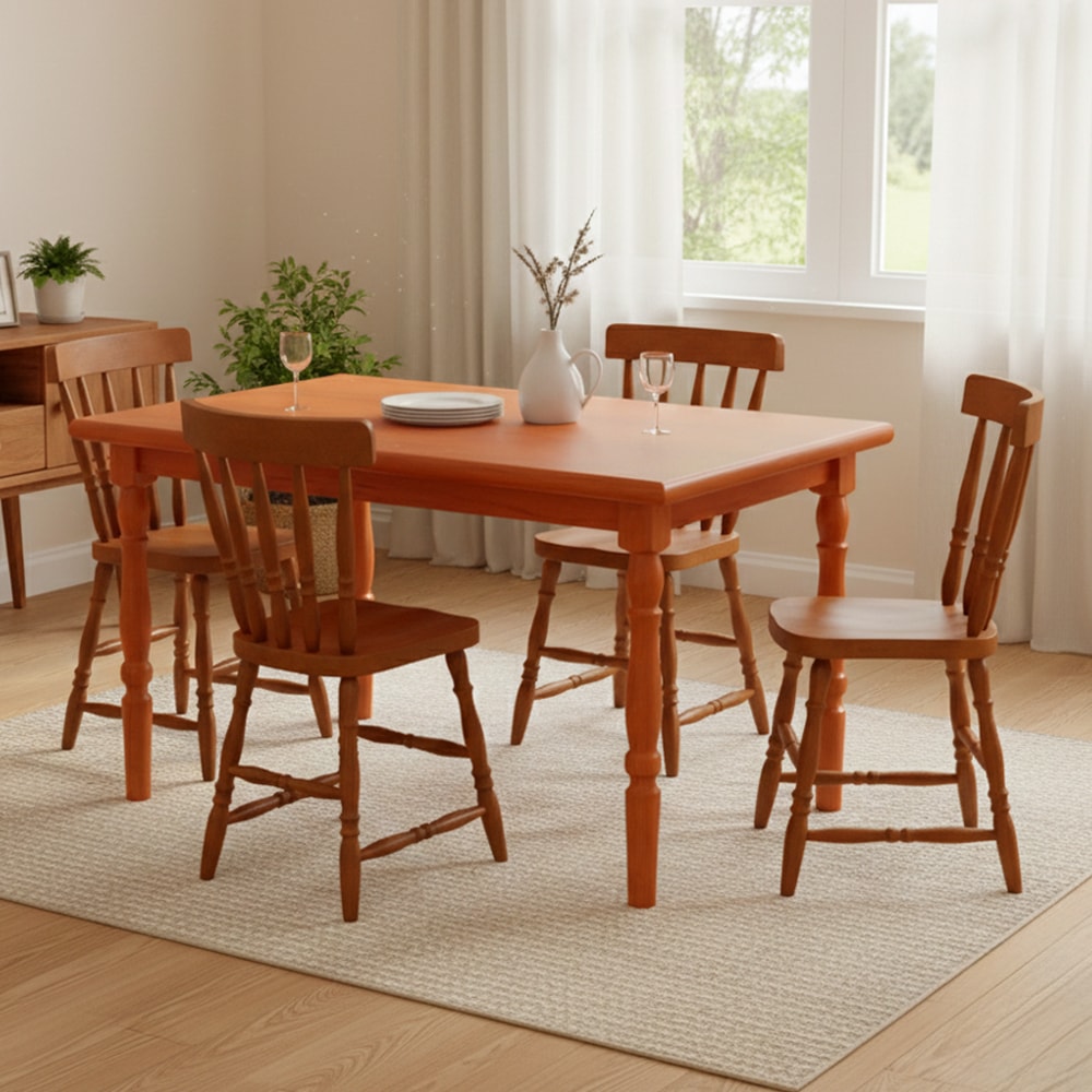 O Conjunto de Jantar 103150LB é a opção perfeita para transformar e valorizar seu lar! Com Mesa ampla acompanhada de 04 Cadeiras, compostas com Estrutura e pés em Madeira Maciça Eucalipto e tampo (mesa) em MDP revestido com lâmina de madeira espessura de 2,3 cm e bordas reforçadas de 3 cm, além de acabamento em verniz brilho. O design é valorizado pelo encosto e pés torneados, com 3,8 cm de largura, assentos com 2,3 cm de espessura, suportando até 120 kg cada. NÃO ACOMPANHA OBJETOS NEM DEMAIS DECORAÇÕES. Este produto será entregue em 3 volumes.