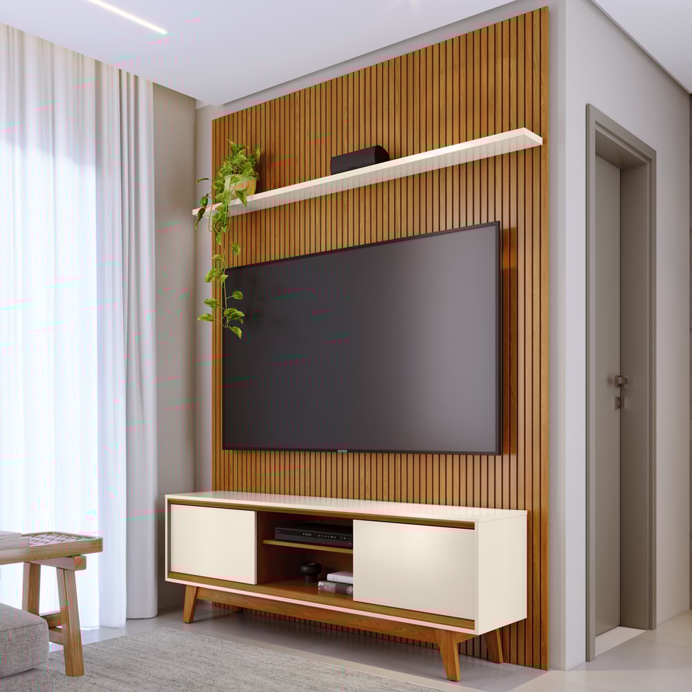 Painel e Bancada Milo, design moderno alinhando estilo e praticidade para o seu dia a dia. Estrutura MDP/MDF com acabamento em pintura UV texturizada. Possui 2 portas de correr (com trilho plástico), 2 prateleiras (interna e superior), tampo e base chanfrados, detalhe ripado do chão ao teto e passa fios. Fixação feita por parafusos. Este produto chegará em sua casa separado em 3 volumes.