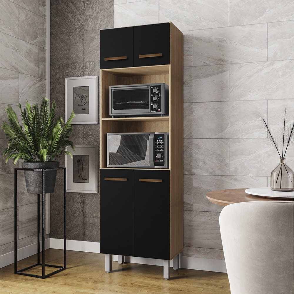 O Paneleiro 4 Portas Mara, possui um amplo espaço interno excelente para armazenar seus utensílios de cozinha e mantê-la sempre organizada. Estrutura toda feita em MDP de 12 e 15mm, com puxadores em plástico cromado e dobradiças metálicas, acompanham pés fixos de 16,5cm que garantem a firmeza que o móvel precisa, com regulagem de altura até 18 cm somente para nivelamento. Este lindo móvel irá deixar seu ambiente ainda mais charmoso e elegante. Perfeito para você que deseja guardar micro-ondas e forno e deixar o ambiente mais harmonizado. Este móvel chegará em sua casa separado em 01 volume.