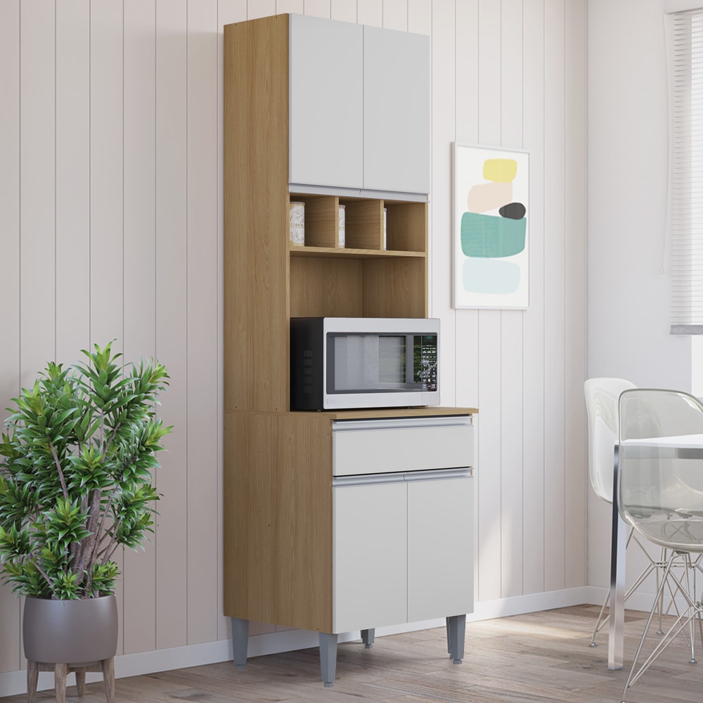 Paneleiro Andreia, desenvolvido para garantir praticidade e elegância na sua cozinha. Produzido em MDP 12/15 mm (fundo 3 mm) com acabamento em pintura UV. Conta com portas e gavetas com dobradiças/ corrediças metálicas e puxadores em alumínio, prateleira interna e nichos adega superior, ideal armazenamento de vinhos e outras garrafas. Além de espaço próprio para forno ou micro-ondas e pés em plástico com regulagem (altura de 17 cm). Produto será entregue em 02 volumes.
