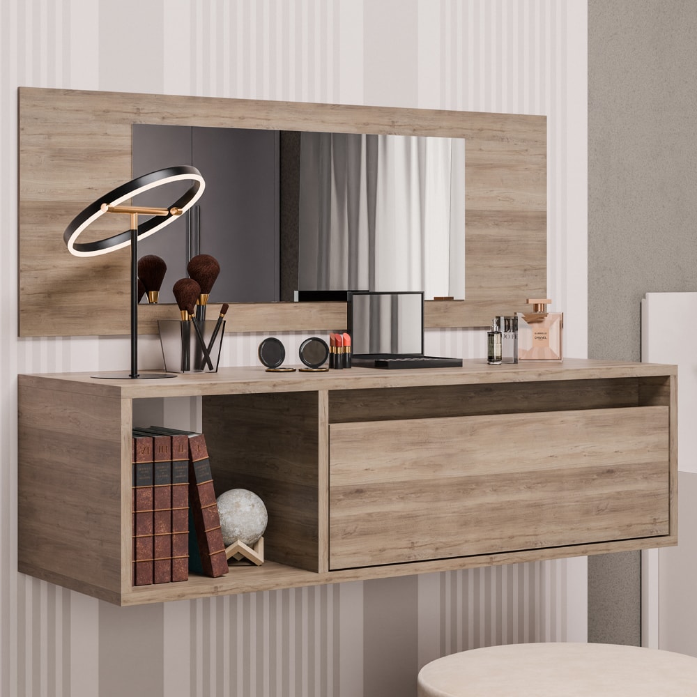 Penteadeira Suspensa Eva, compacta, moderna e funcional! Estrutura em MDP 15 mm com acabamento BP. Possui porta basculante com dobradiças metálicas (sem puxador, com sistema de abertura passante), espaço de armazenamento interno, nicho lateral decorativo e painel com espelho (L.57 cm x A.25 cm). Produto será entregue em 01 volume.