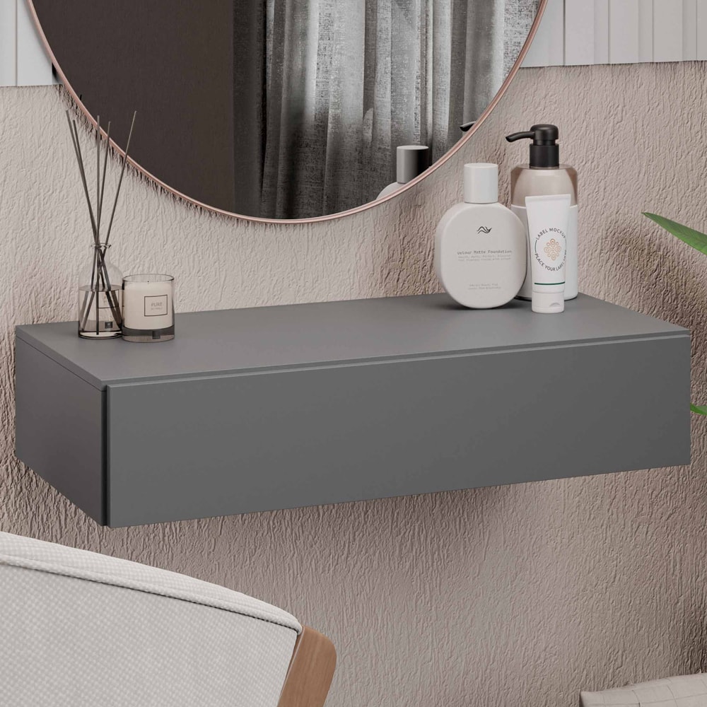 Penteadeira Suspensa Zoe, design clean que valoriza o ambiente! Estrutura em MDP 15 mm com acabamento BP (durável, resistente à umidade e não descasca). Conta com 1 gaveta equipada com corrediça telescópicas e tampo com ampla superfície para maior organização e praticidade no seu quarto. Produto será entregue em 01 volume.